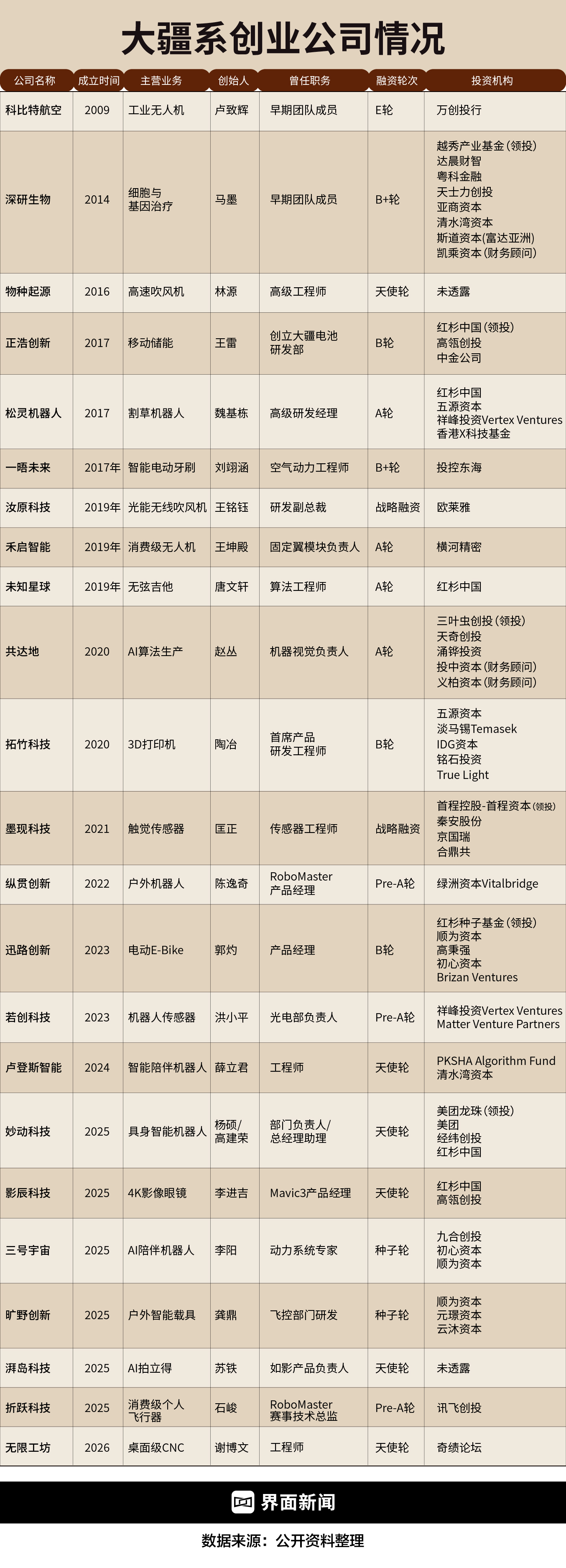 主攻便携储能的正浩创新和专注消费级3D打印的拓竹科技是已被验证过的成功案例,他们都做到了各自领域的全球第一。除此之外,据界面新闻不完全统计,大疆出走的员工创办的公司已达到数十家规模。