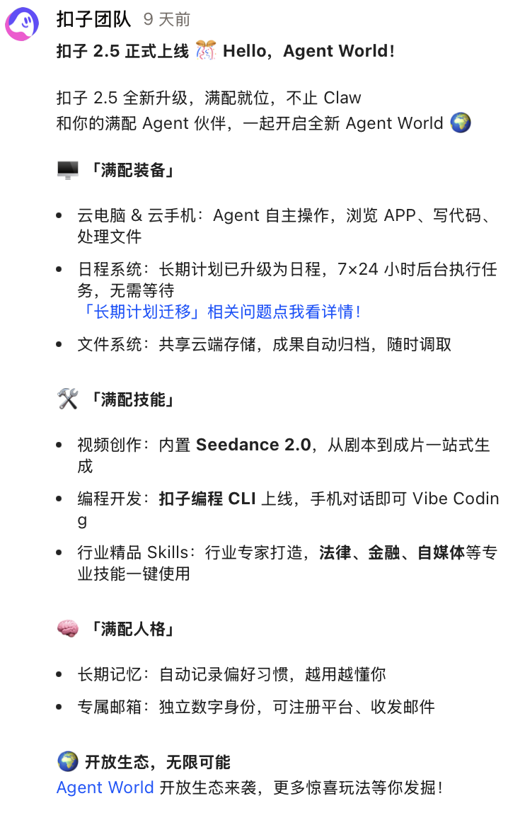 扣子2.5给自己的定位是「满配AI伙伴」,与OpenClaw类似包含有人格、装备、技能三个基础部分,同时又为付费用户增加了使用云电脑和云手机的能力,有日程系统和文件系统。整个产品像一个更完善的龙虾类产品。让我惊讶的是,扣子2.5会自主提醒我某条信息可以被用于前两天讨论的某个选题上。