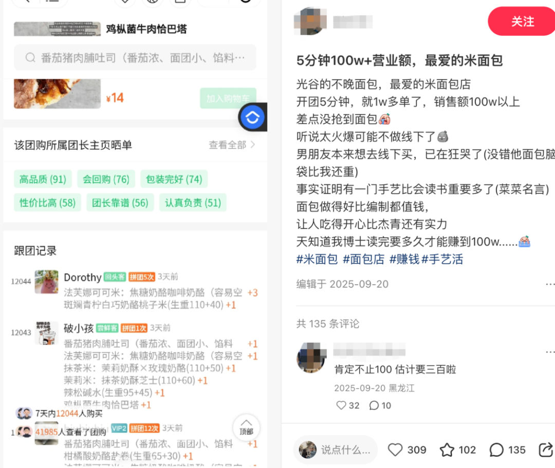 究其原因,面包本身属于强体验、高复购、重口碑的品类,因而在烘焙爱好者圈层中,经由熟人信任背书,转化效率更高。