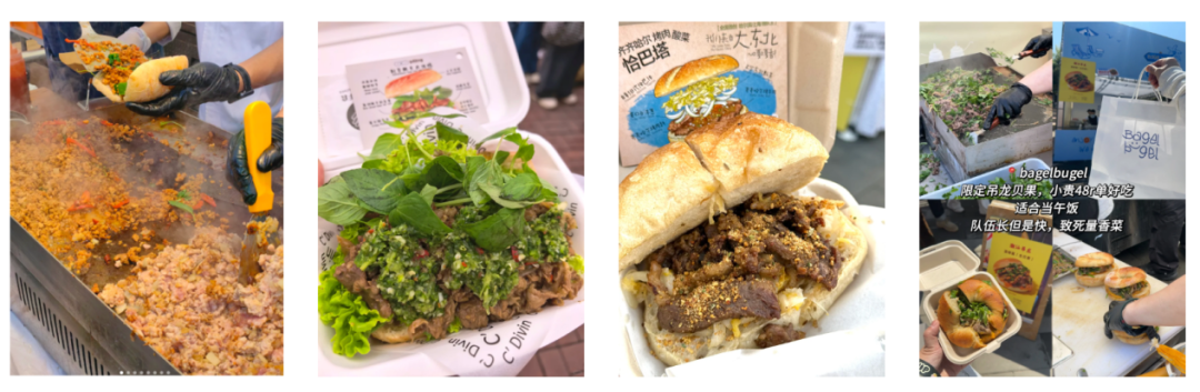 售价 32 元的泰式猪肉打抛恰巴塔、48 元的潮汕吊龙湿贝果、39 元的河南荆芥肥牛米法棍,大多都是现场炒制锅气十足,每一款都大排长龙。