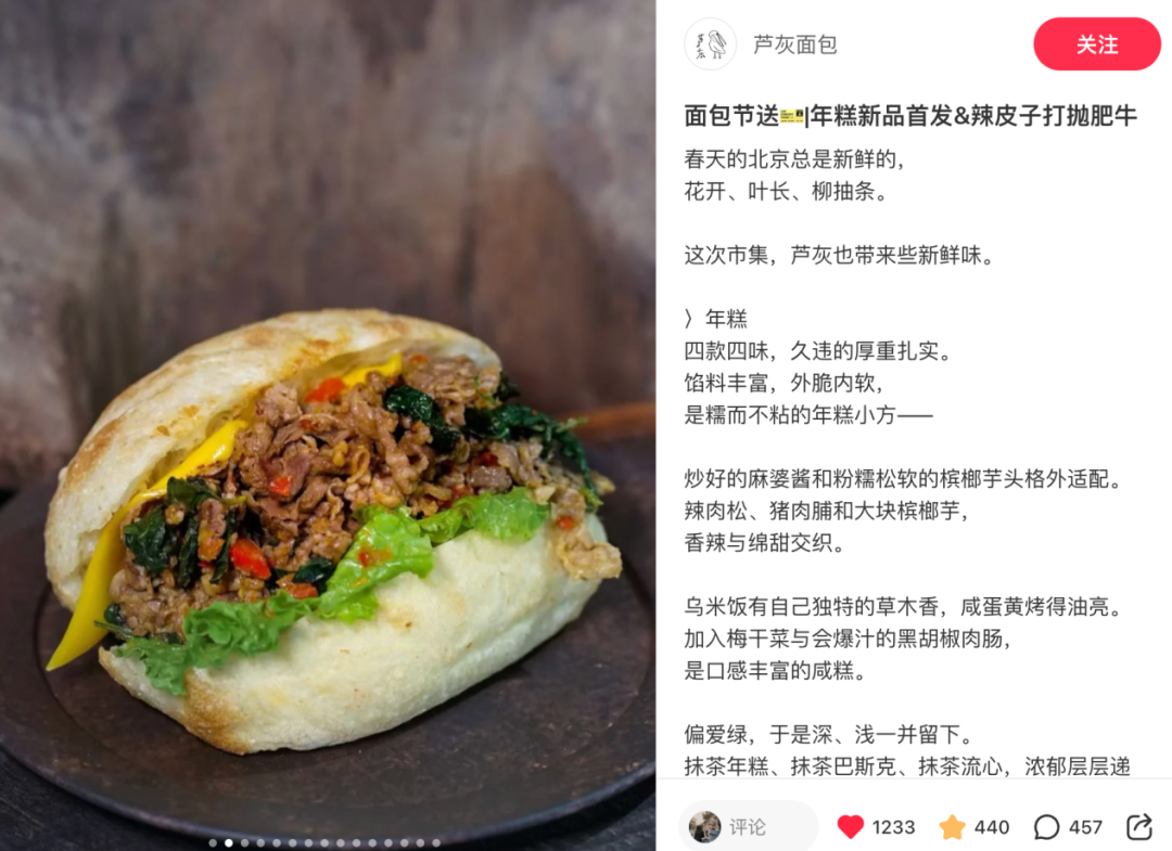 北京本土品牌芦灰面包主打野生酵母吐司,此次便在面包节首发年糕新品与辣皮子打抛肥牛,将西北浓烈风味与日式酸种酵种巧妙融合,既守住了酸种面包的专业底色,又精准击中北京食客偏爱重口、香辣香浓的味蕾偏好。