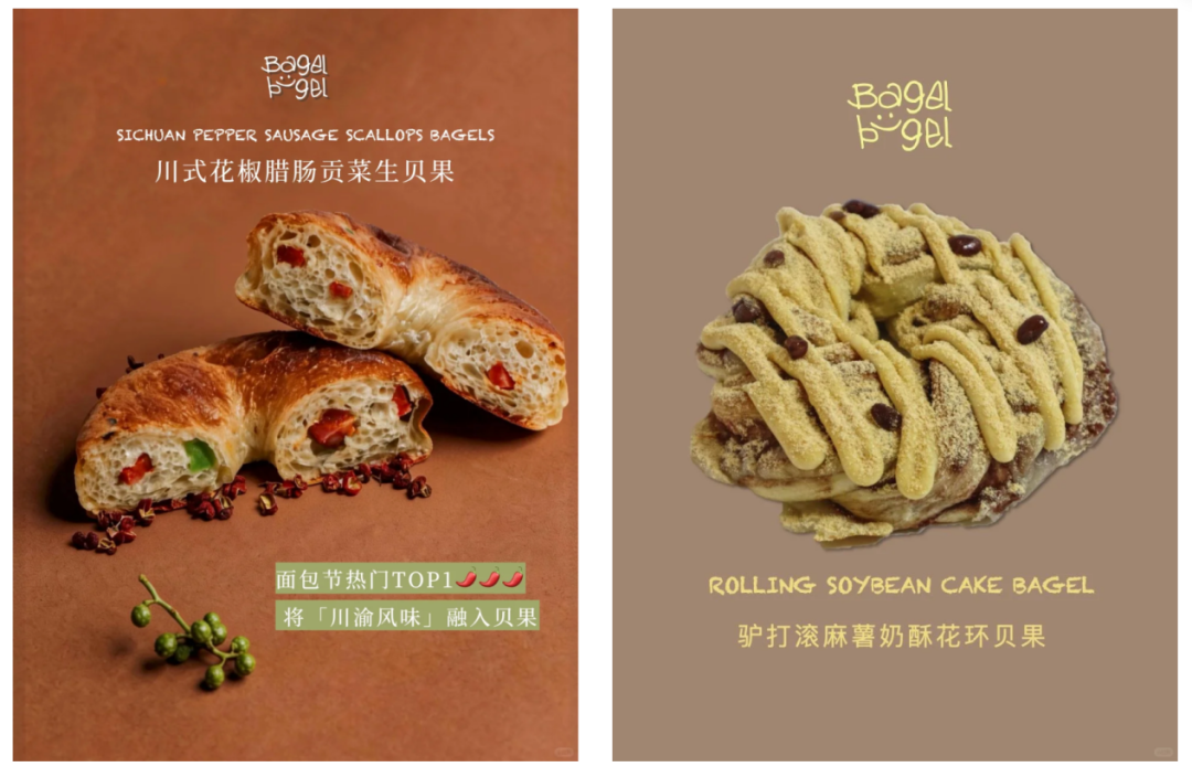 北方品牌更侧重低糖健康与本土创意混搭,以北京本土贝果品牌 Bagel bügel 为例,大胆采用中西融合,潮汕吊龙贝果、川式花椒腊肠贡菜生贝果、老北京驴打滚麻薯奶酥花环贝果……