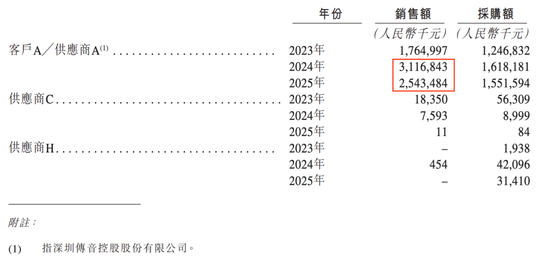 2023年至2025年,易景科技向传音控股的销售量分别占各年度总销售量的77.7%、86.5%及65.8%;由此带来的销售收入分别为17.65亿元、31.17亿元、25.43亿元,占公司总收入的比例分别为79.3%、88.8%、79.0%。