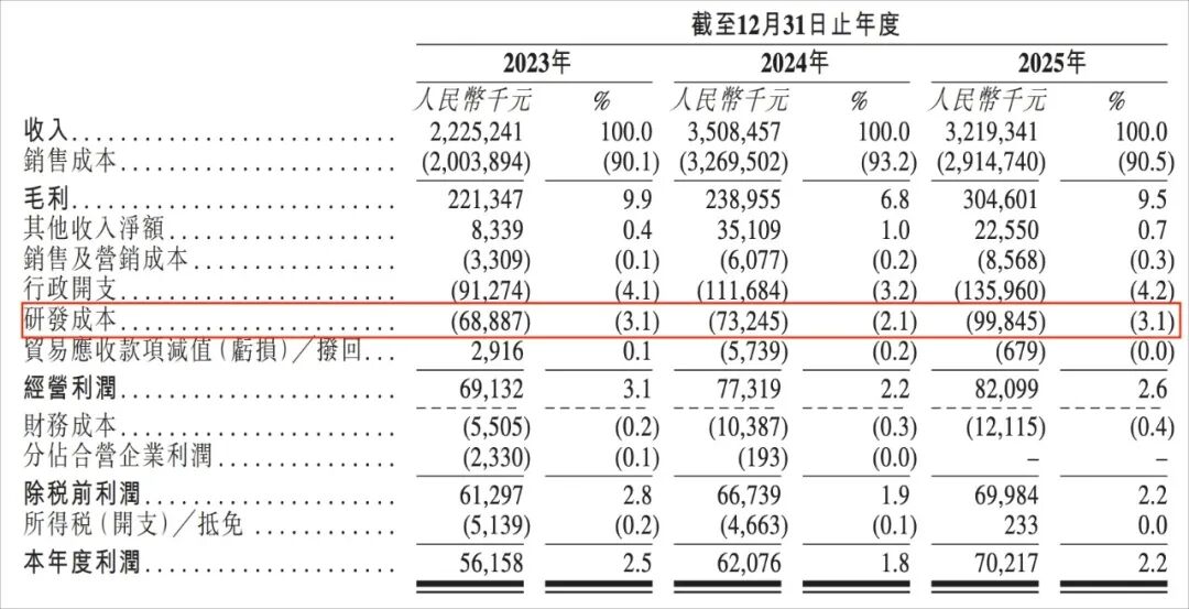招股书数据显示,2023年至2025年,易景科技的研发成本分别为6888.7万元、7324.5万元及9984.5万元,三年累计不足2.4亿元,研发费用率始终维持在2.1%至3.1%之间。