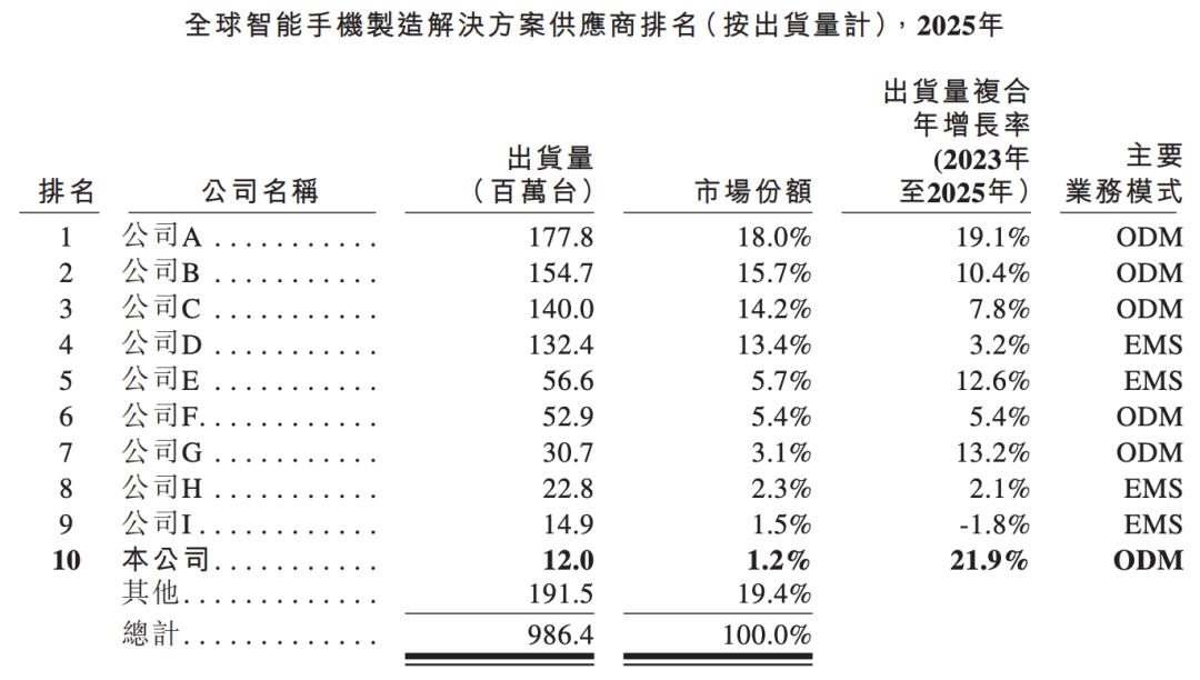 根据弗若斯特沙利文数据,按2025年出货量计,易景科技在全球智能手机制造解决方案供应商中排名第十,在ODM模式的供应商中排名第六,且是TOP10榜单中增长最快的企业,2023年至2025年,公司出货量复合年增长率达21.9%。