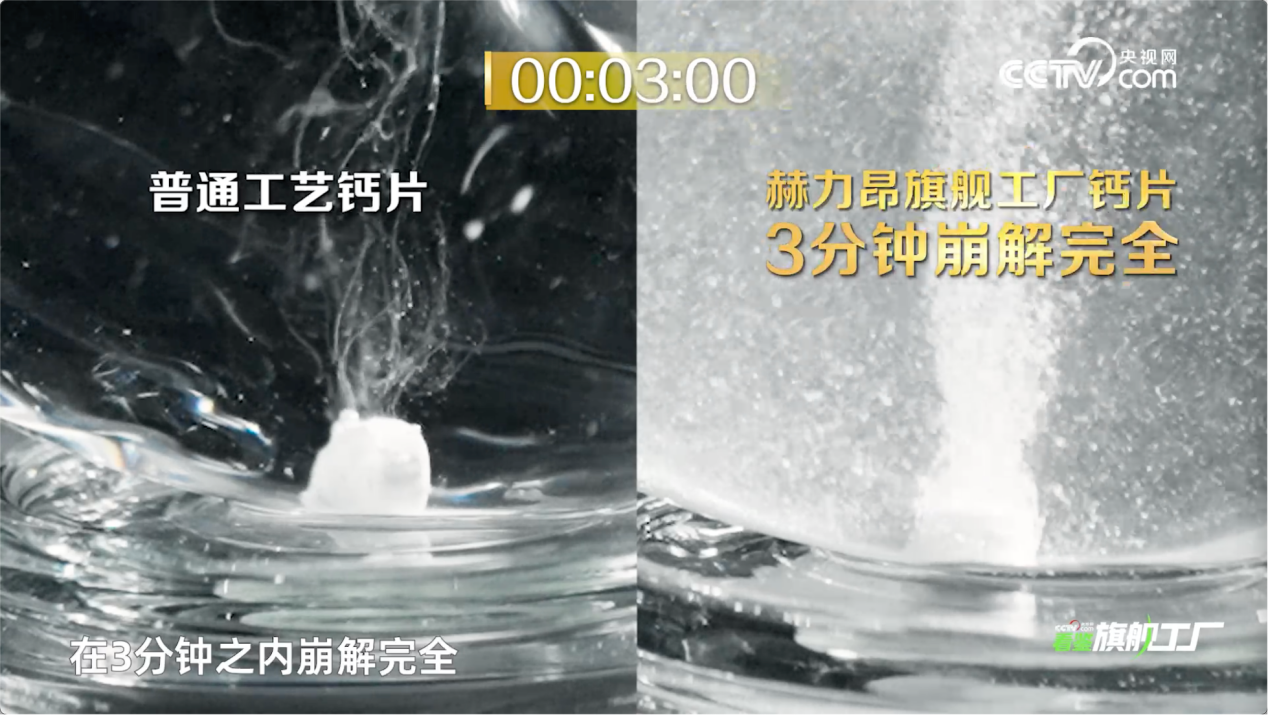 在赫力昂中国研发中心,赫力昂中国研发工程师石铭用一场钙片崩解实验,向朱迅展示了不同钙片的吸收效率差异。在模拟人体胃液环境中,明显看出赫力昂旗舰工厂生产的真吸收钙片3分钟内完全崩解,10分钟内充分溶出。