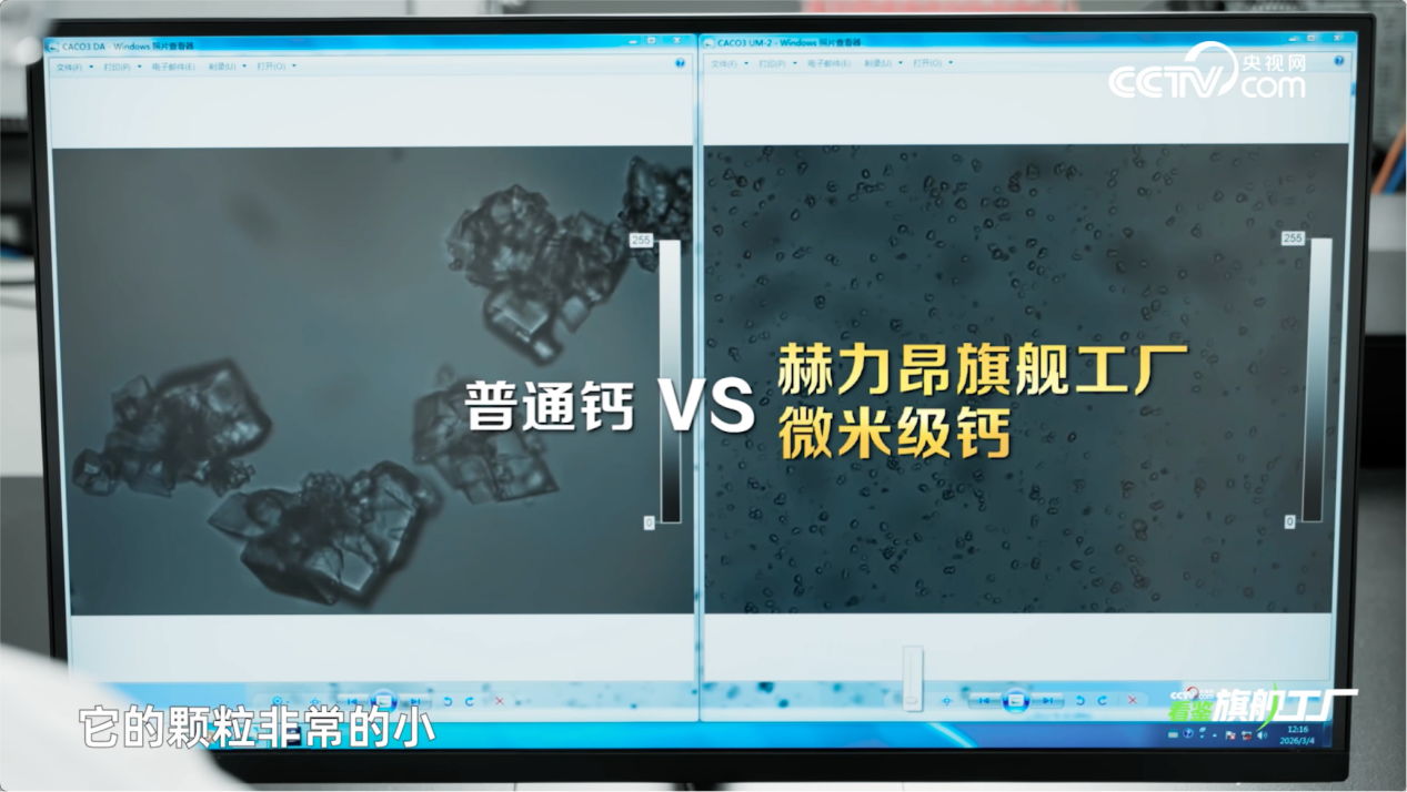 (显微镜下,赫力昂旗舰工厂微米级钙比普通钙小10倍以上)