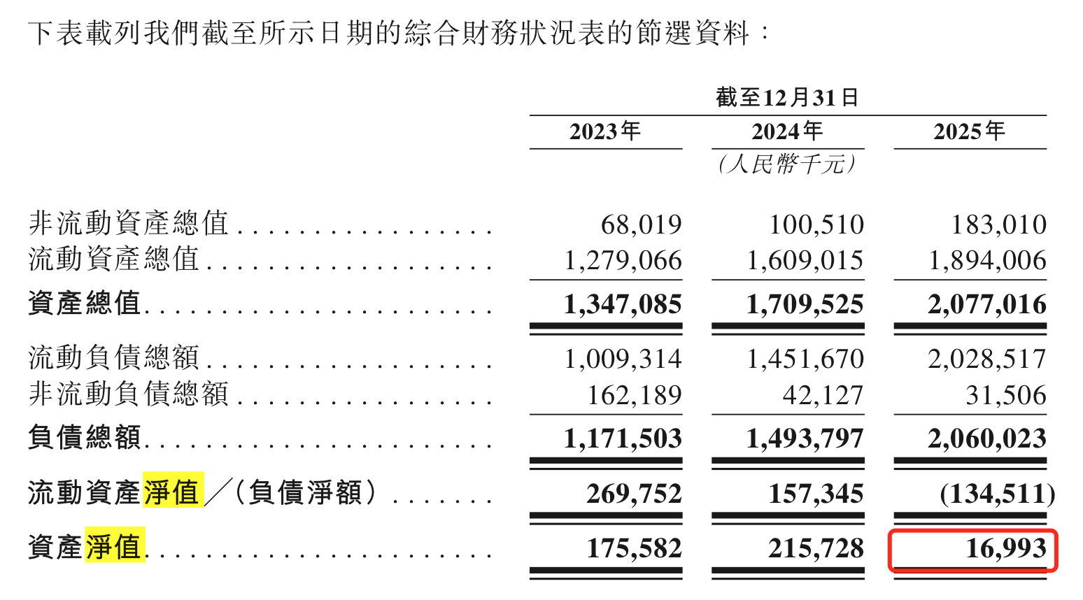 与此同时,公司当前的财务状况不足以应对这场“豪赌”的失败。招股书数据显示,截至2025年12月31日,好医生云医疗账上的现金及现金等价物仅剩5851.7万元(较2024年1.28亿元“腰斩”),而公司的资产净值在过去一年内更是上演了“大跳水”,从2024年末的2.16亿元骤降至2025年末的1699.3万元。公司2025年资产总值20.77亿元,负债总额20.6亿元,资产负债率高达99.18%。