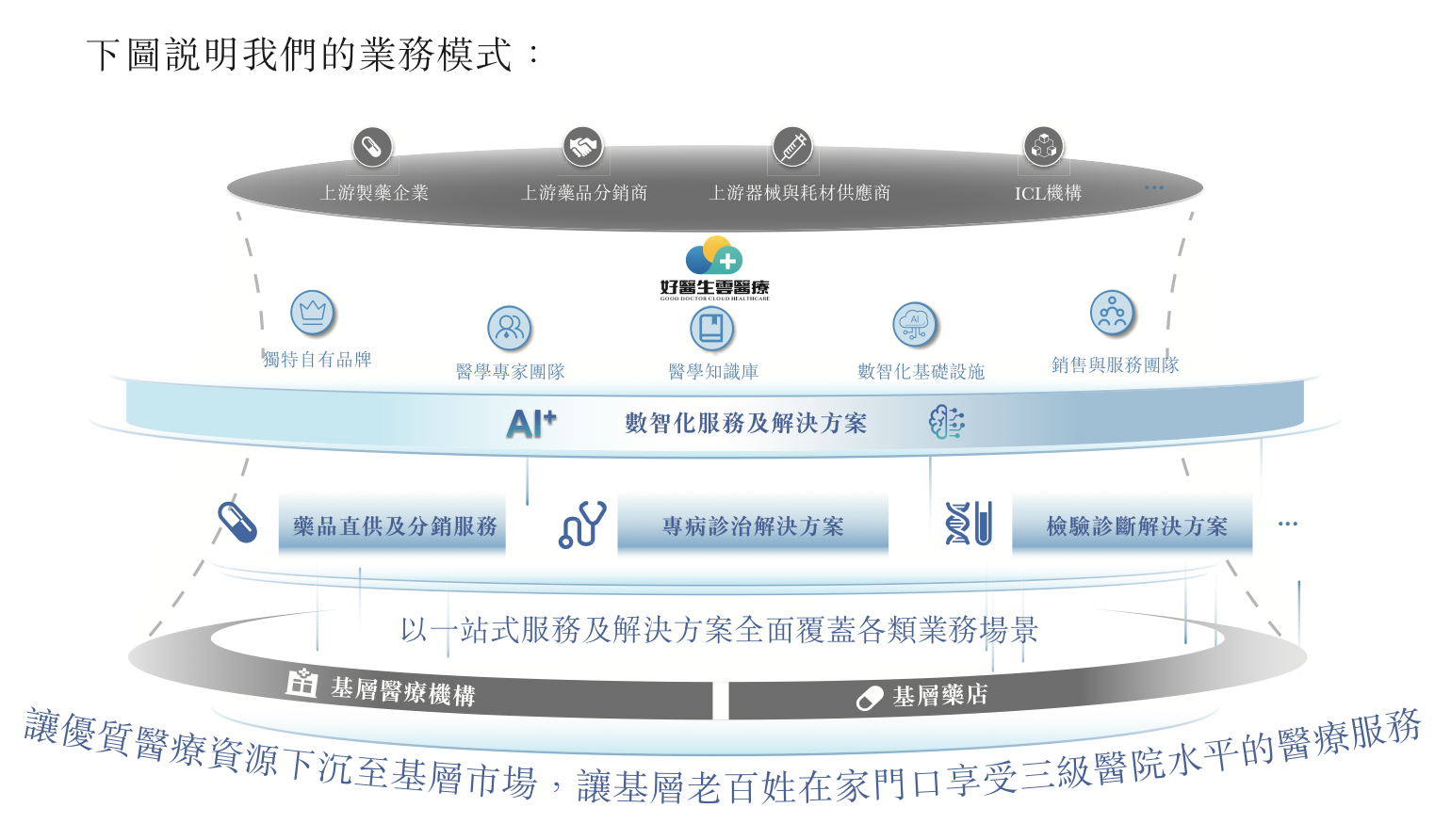 根据灼识咨询数据,好医生云医疗是中国基层医疗行业中唯一实现检验、诊断、用药及诊疗一体化业务场景全覆盖的服务及解决方案提供商。以2024年收入计,公司在国内基层医疗药品直供市场排名第二。