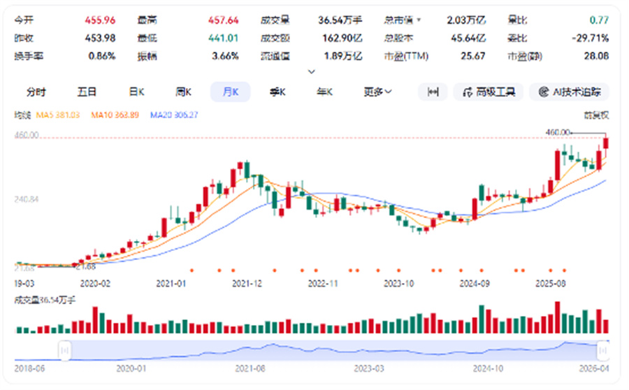 宁德时代股价走势图(月线)