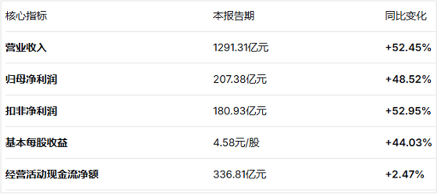 华夏能源网获悉,4月15日晚,宁德时代(SZ:300750)披露2026年第一季度业绩,营收1291.31亿元,同比增长52.45%;归母净利润207.38亿元,同比增长48.52%。