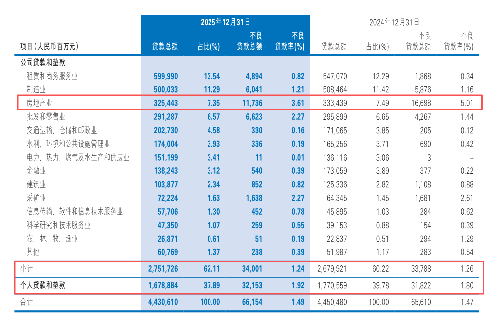 截至2025年末,房地产不良贷款余额为117.36亿元,不良贷款率仍达3.61%,远高于全行平均不良水平。