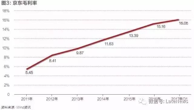上述举措使得京东经营利润率加速由负变正(Non-GAAP下经营利润率从2015年的-0.9%变成2016年的0.4%)。同时,聚焦主业带来了毛利率的提升——这正是其2017年Q1实现盈利的核心原因。京东的毛利率从2011年的5.45%,上涨至2014年的11.63%,再到2016年的15.16%。2017年Q1,其毛利率为16.05%,