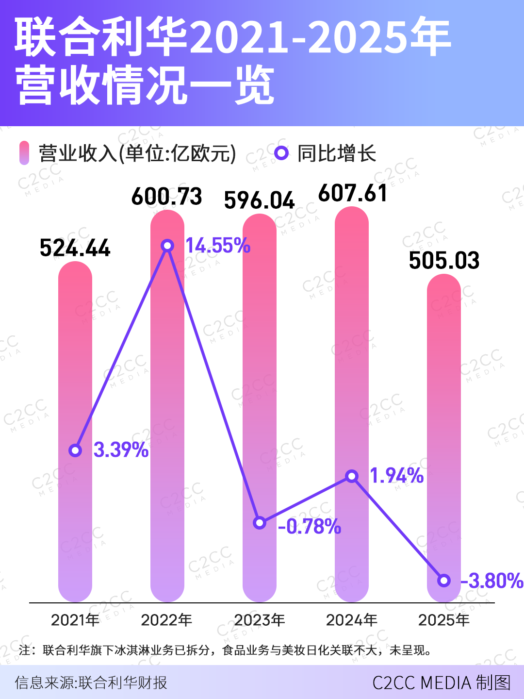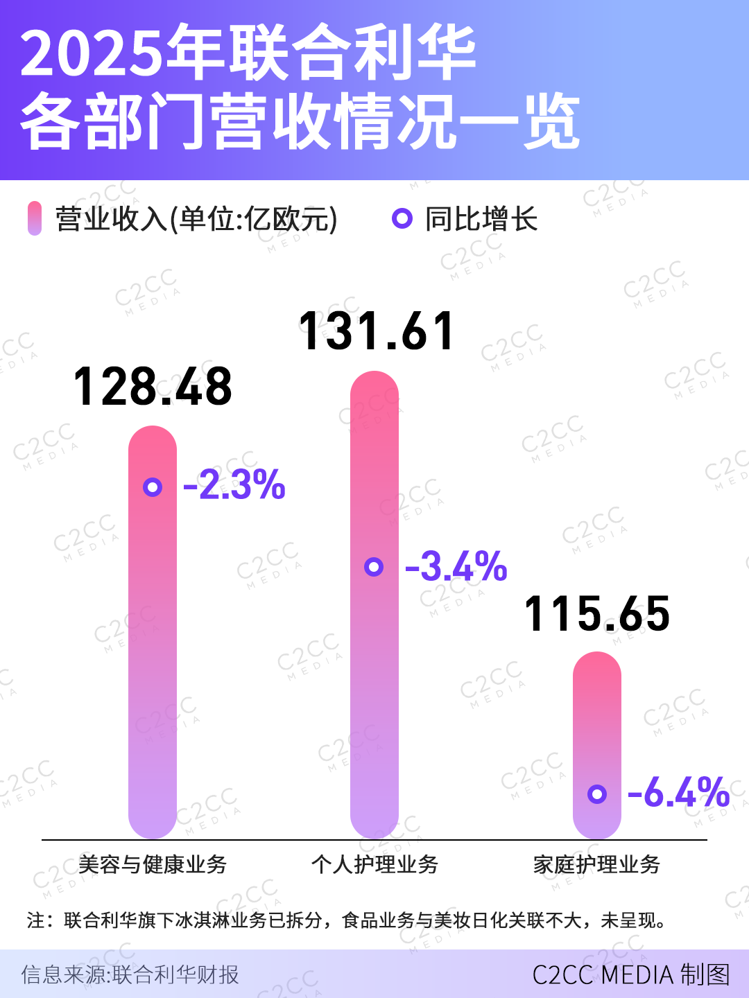 2025年财报数据显示,其四大核心业务板块营收全线下滑,其中美容与健康、家庭护理业务由增转跌,个人护理业务跌幅更是扩大至3.4%。拉长时间看,其营收增长自2022年后便近乎停滞,除2024年微增1.94%外,2023年与2025年分别出现0.78%和3.8%的同比下滑。