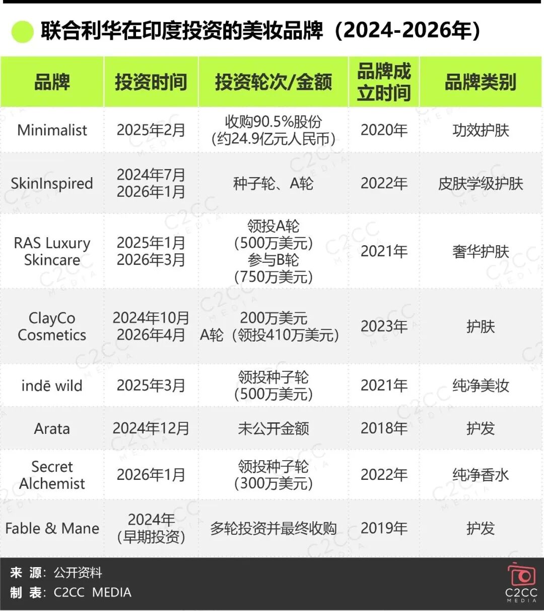 据C2CC传媒X新妆梳理,仅过去两年内,其在印度市场就完成了至少8笔相关投资,目标从初创品牌到成熟品牌不等。这种“广覆盖、快节奏”的投资策略,旨在精准捕捉印度美妆市场爆发前夜的全赛道增长机遇,展现了其抢占新兴市场高地的决心。