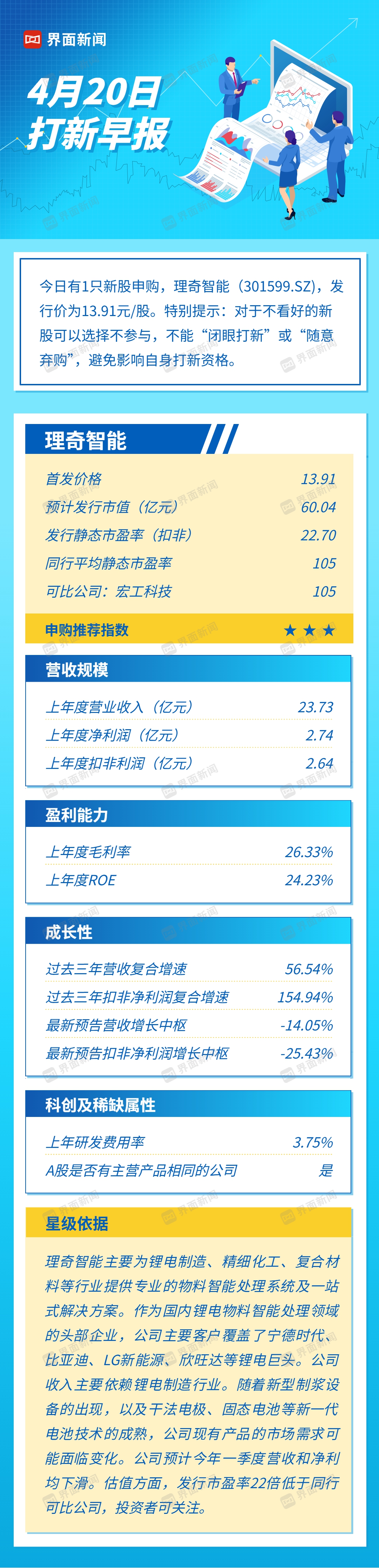 今日有1只新股申购,理奇智能(301599.SZ),发行价为13.91元/股。特别提示:对于不看好的新股可以选择不参与,不能“闭眼打新”或“随意弃购”,避免影响自身打新资格。