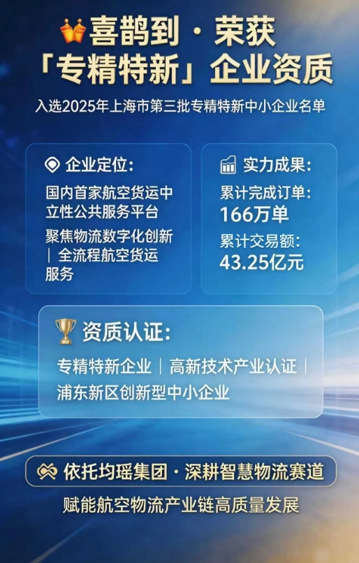 近日,上海市 2025 年度第三批专精特新中小企业认定名单正式公布,上海喜鹊到网络技术有限公司凭借在空运物流数字化领域的技术创新、专业服务与行业贡献,成功入选,荣获 “上海市专精特新中小企业” 认定。