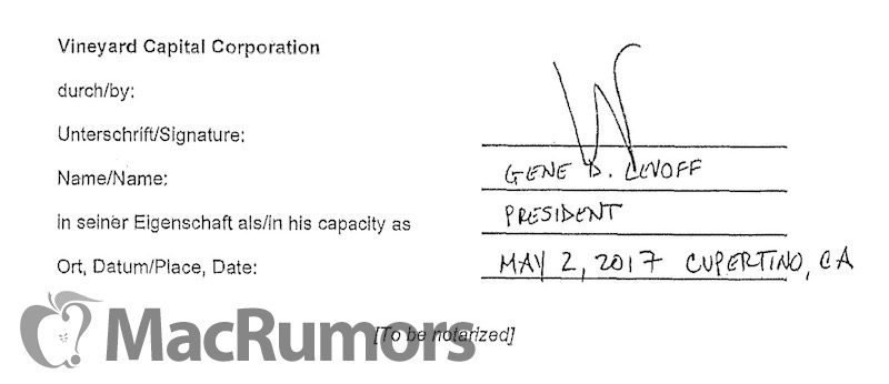 泄露文档显示,5 月 2 日,一家名为 Vineyard Capital 的公司在苹果总部所在地库比蒂诺市,签署了对 SMI 全部股份的收购协议。虽然苹果试着用注册壳公司的方式减弱自己在其中的影响,但苹果副总裁 Gene Levoff 的名字和签字地点,依然将背后的苹果公司显露出来。