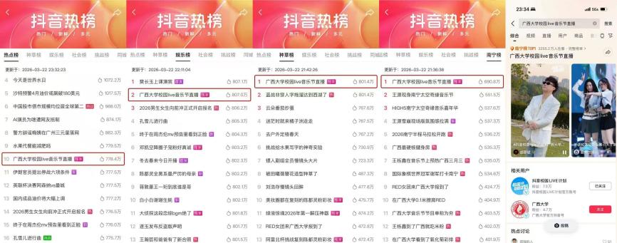 这种累积效应在数据层面亦有体现,持续在场带来的关注度在最后一站达到了新的峰值。活动期间,广西大学站相关内容在抖音平台拿下热榜热点榜第一、娱乐榜第二、种草榜第一、南宁榜第一。但更值得注意的或许不是数字本身,而是这些数字背后的现象——之前四站的内容在平台上持续发酵,形成了一个可回溯的内容池和固定的粉丝群。当广西大学站开启时,流量自然汇入其中,形成叠加效应。