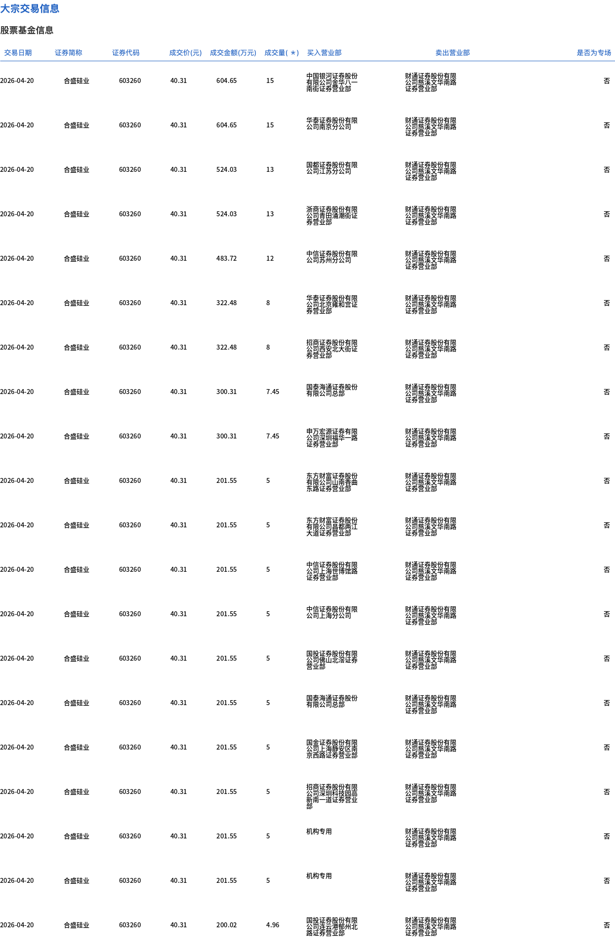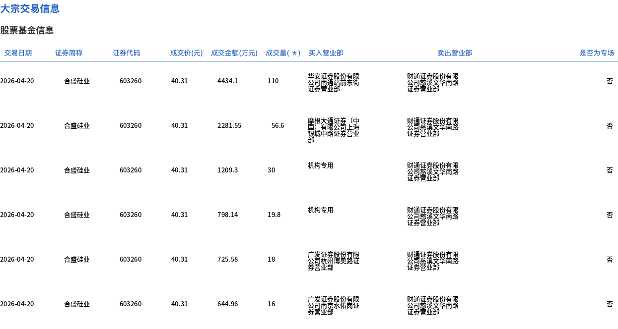 4月20日,合盛硅业大宗交易成交404.26万股,成交额1.63亿元,占当日总成交额的22.49%,成交价40.31元,较市场收盘价45.09元折价10.6%。