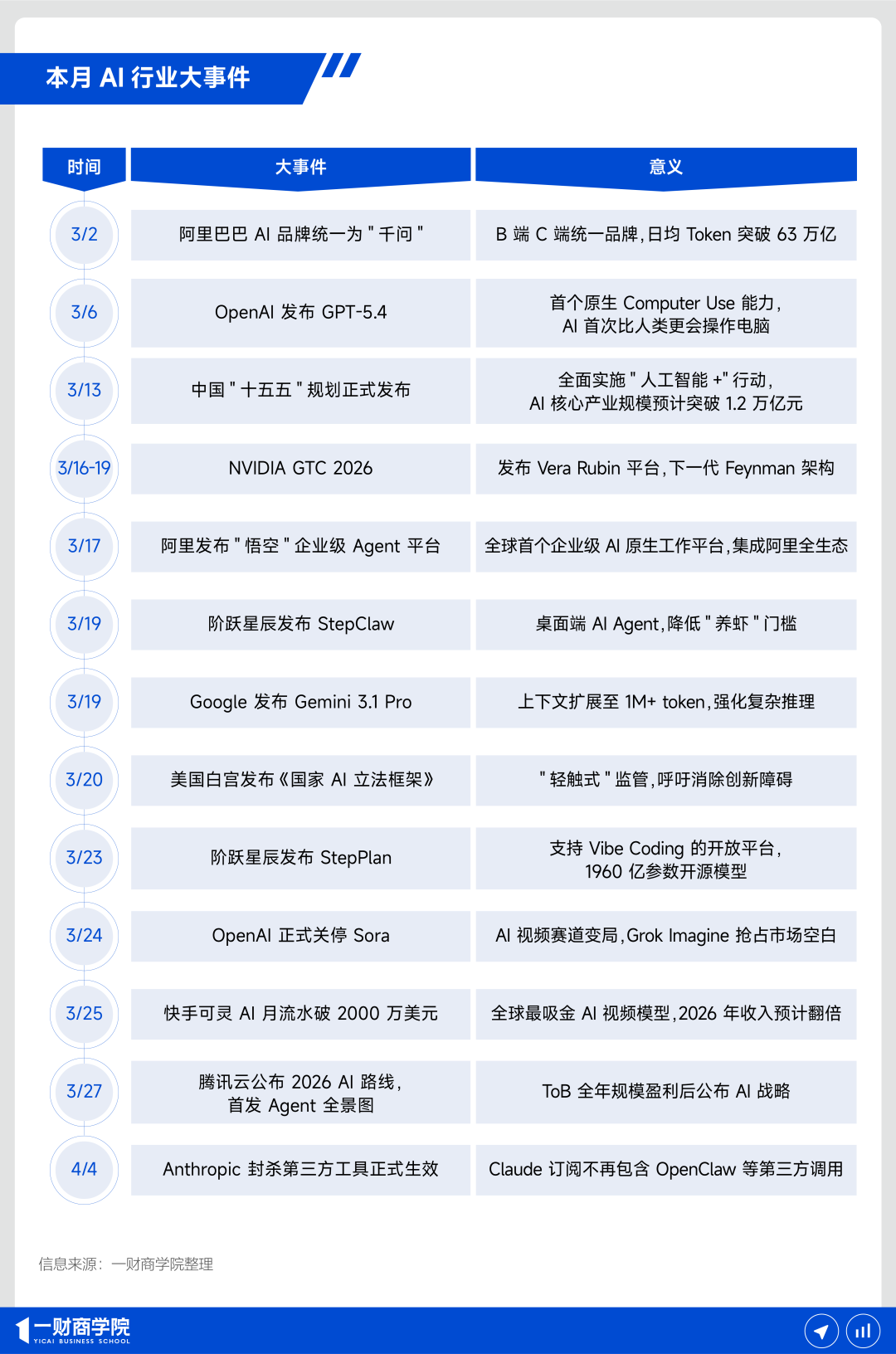 回顾龙虾余温中的3月,6款国产Agent密集上工、中国模型强势霸榜API调用量、Anthropic依靠B端编程业务完成营收反超,以及Sora因成本重压的黯然退场,都在指向一点: