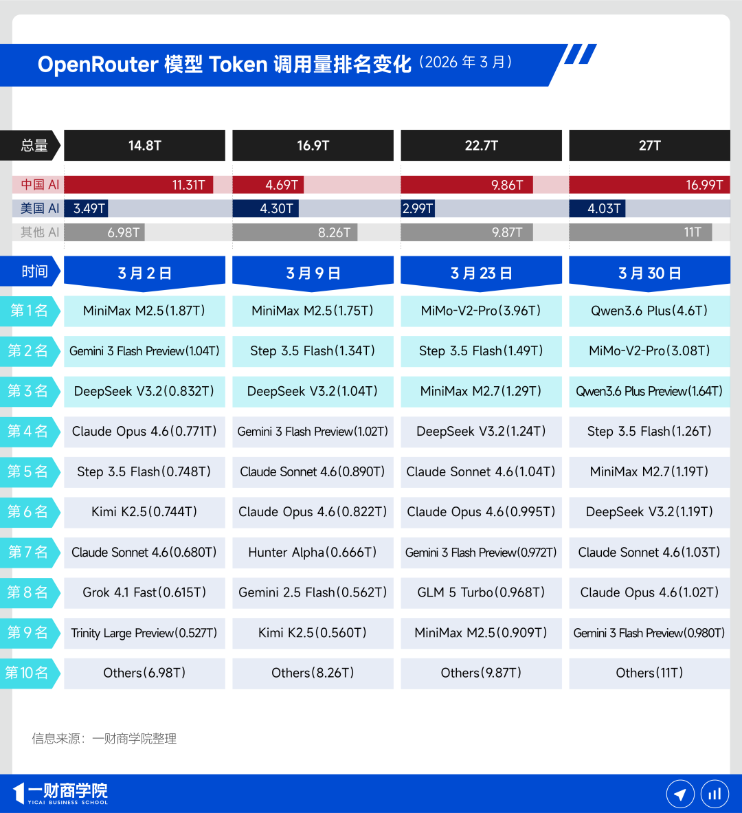 既然让Agent干活需要消耗海量Token,最理性的选择是,哪个模型便宜就选哪个。在这场红利中,中国AI厂商凭借全球最低的推理成本和持续不断的工程优化,成了第一阶段最大的赢家。3月底OpenRouter的数据显示,全球模型调用量前6名都是中国AI。