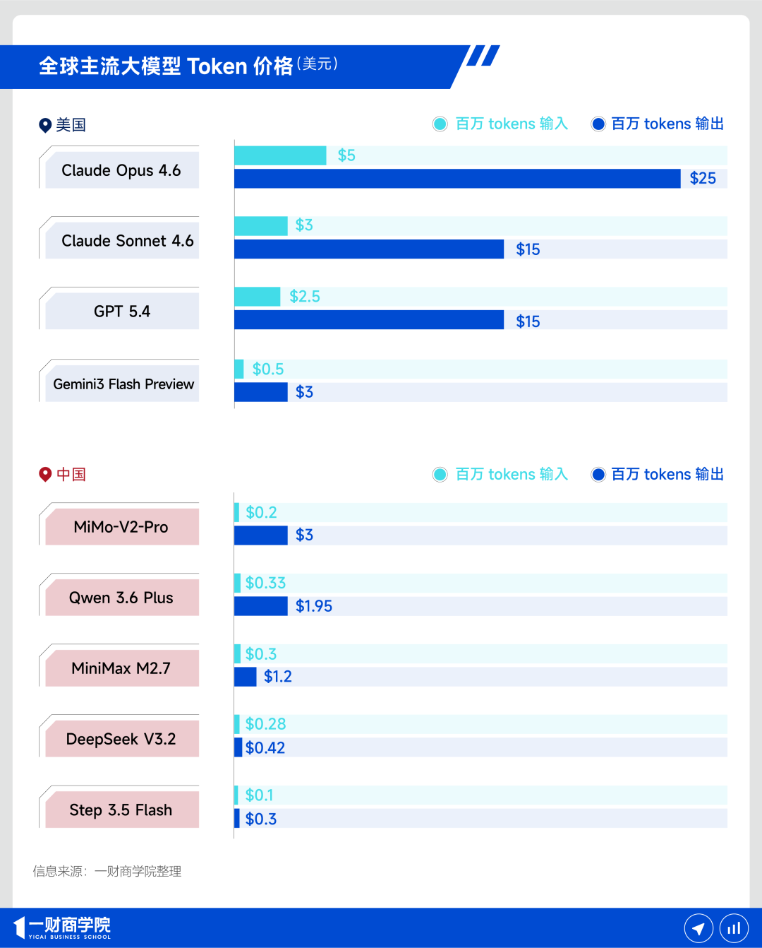 但随着Agent的Token需求量加大,模型厂为了抢份额,免不了价格内卷。截至3月底,主流模型中最便宜的是阶跃星辰的Step 3.5 Flash,百万Tokens输出价格已经卷到0.3美元,最贵的Claude Opus 4.6是它的82倍。