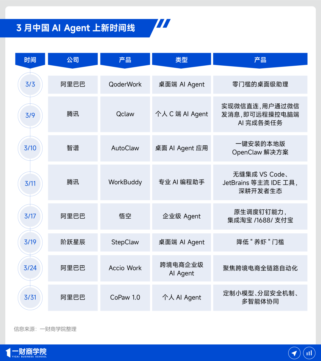 3月里,阿里、腾讯、智谱、阶跃星辰等大厂密集砸出了8款重磅Agent产品。这其中,尤其以腾讯和阿里的战略落子最为密集。