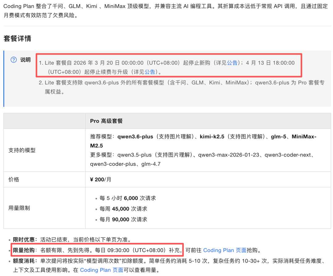 不过随着算力成本上涨,这种编程套餐也在纷纷涨价或者“限购”。比如阿里云百炼4月13日起最便宜的Lite套餐就要停售了,智谱的Coding Plan 2月时也涨价了30%。