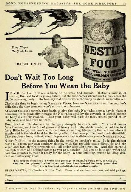 1867年,出生于德国的药剂师亨利·雀巢(HenriNestlé)首次推出了易于消化的母乳替代品,名为“farine lactée”,也就是为我们所熟知的奶粉。在不到十年的时间里,雀巢的年均销售达到了100万罐。