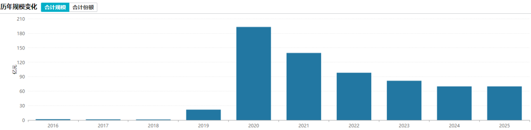 该产品2025年实现48.99%收益率,表现优异,不过2022-2024年连续三年亏损,且有两年收益率排在同类产品中下水平,自2020年产品规模达到193.03亿元以来,此后几年持续缩水。尽管2025年取得较为优秀的投资业绩,也未能扭转规模下滑趋势,相较规模峰值缩水63.9%。