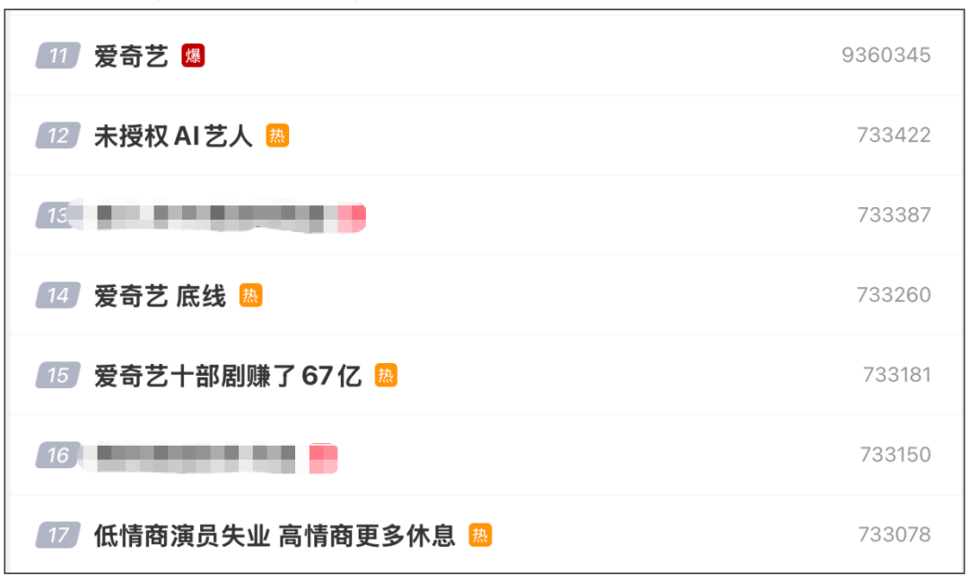 图:与“爱奇艺”相关的热搜话题,来源:微博 《听筒Tech》截图