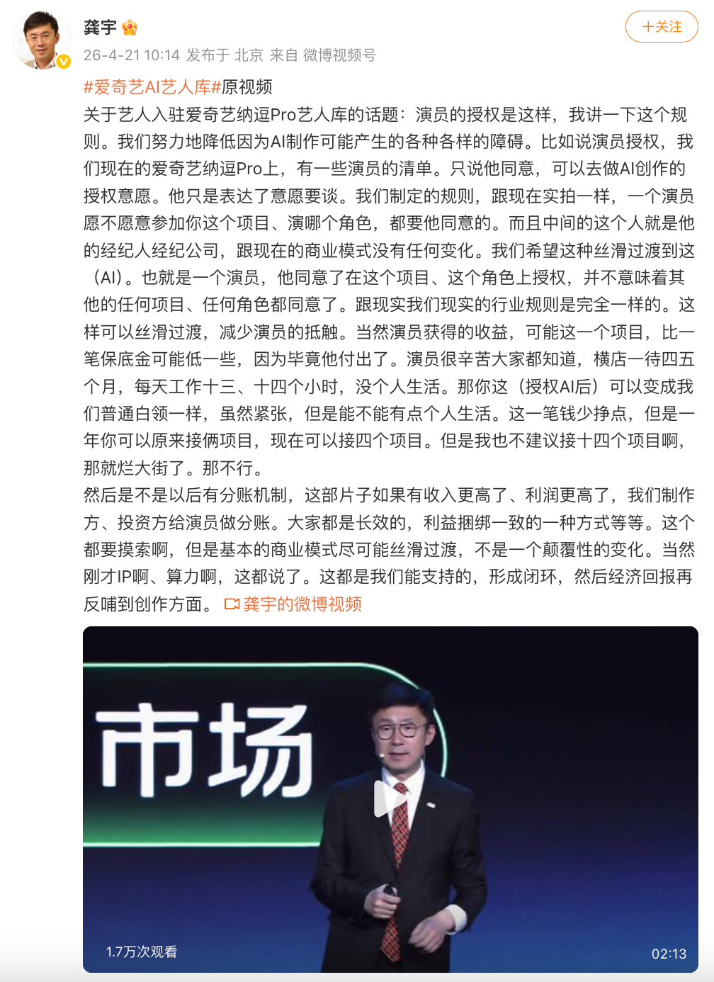 4月21日,爱奇艺CEO龚宇发文谈AI艺人库,“演员的授权是这样,我讲一下这个规则。我们努力地降低因为AI制作可能产生的各种各样的障碍。比如说演员授权,我们现在的爱奇艺纳逗Pro上,有一些演员的清单。只说他同意,可以去做AI创作的授权意愿。他只是表达了意愿要谈。我们制定的规则,跟现在实拍一样,一个演员愿不愿意参加你这个项目、演哪个角色,都要他同意的。而且中间的这个人就是他的经纪人经纪公司,跟现在的商业模式没有任何变化。我们希望这种丝滑过渡到这(AI)。也就是一个演员,他同意了在这个项目、这个角色上授权,并不意味着其他的任何项目、任何角色都同意了。跟现实我们现实的行业规则是完全一样的。这样可以丝滑过渡,减少演员的抵触。”