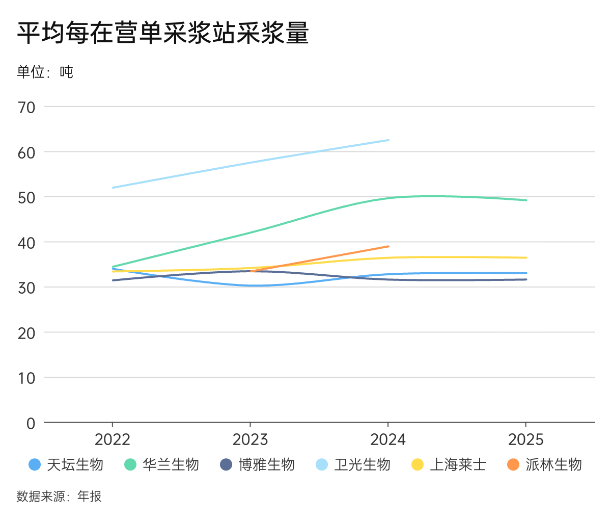 界面新闻统计,博雅生物2024年有20个浆站,采浆量630.6吨;2025年增至21个浆站,采浆量662.31吨,单站效率基本仍在31.5吨左右。天坛生物2024年和2025年都是85个浆站,单站效率只从32.7吨微升到33吨。华兰生物则从49.6吨小幅降到49.1吨,上海莱士基本维持在36.4吨。
