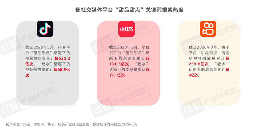 数据显示,截至2026年3月,“糖水”相关话题视频在抖音、快手平台的播放量分别超68.9亿次和超9亿次,另外在小红书“糖水”的话题浏览量也累计超19.1亿次。热度之下,一批糖水品牌迎来发展机会,近年来门店数量得到快速增长。