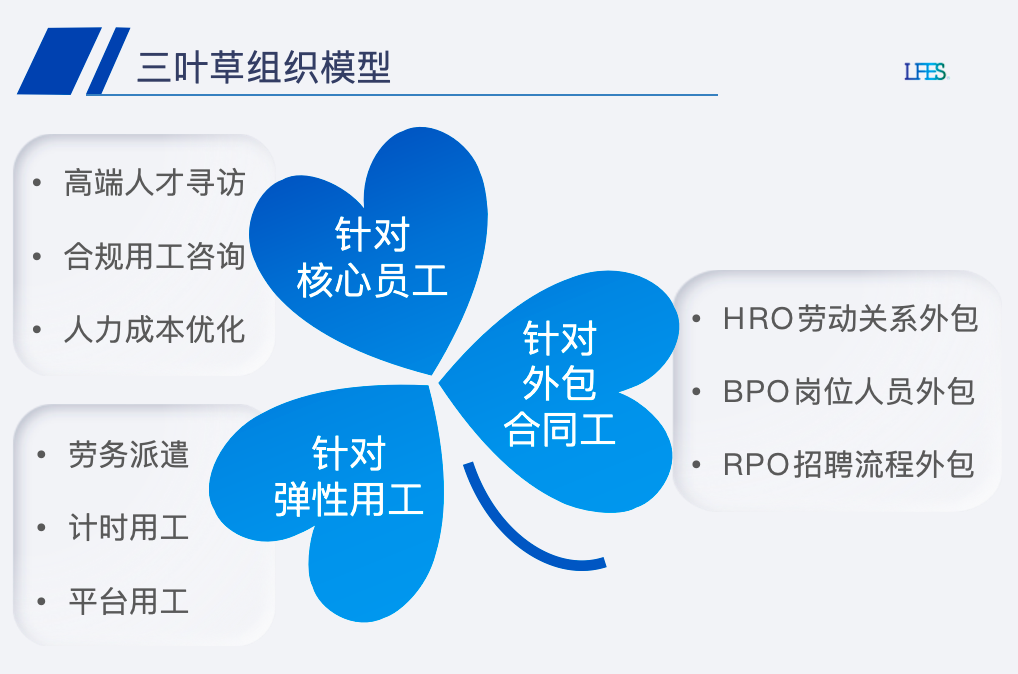 随着Z世代职场主力军对工作灵活度、职业成长需求的日趋多元,以及全国社保政策动态调整、区域间政策差异的显著提高,企业人力资源管理面临适配性与合规性双重挑战。在此背景下,联服集团主动顺应行业进化趋势,立足多元化用工需求与政策导向,率先依托国际先进的三叶草组织模式理论内核,创新构建全覆盖、定制化的一站式人力资源解决方案,精准覆盖核心员工、外包合同工、弹性用工三大群体,全面打造适配新时代的人力资源服务新生态。