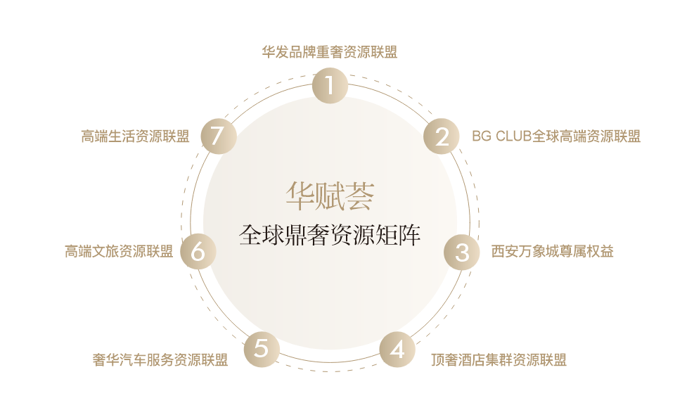 深度联动华发品牌旗下重奢资源联盟,涵盖休闲、度假、美食、娱乐等多元专属权益,尽享非凡。凝萃BG CLUB全球高端资源联盟,精准匹配高端需求。汇集西安万象城重奢资源、顶奢酒店集群、奢华汽车服务、高端文旅矩阵、高端生活体验,通过专属通道、定制服务与尊享礼遇,全方位构筑尊贵生活版图。