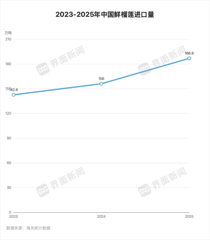 作为全球最大的榴莲消费市场,2025年,中国鲜榴莲进口量达186.8万吨,进口额74.8亿美元(约合543亿元人民币)。其中,鲜榴莲进口数量同比增长 19.7%,是第一大水果进口品类。