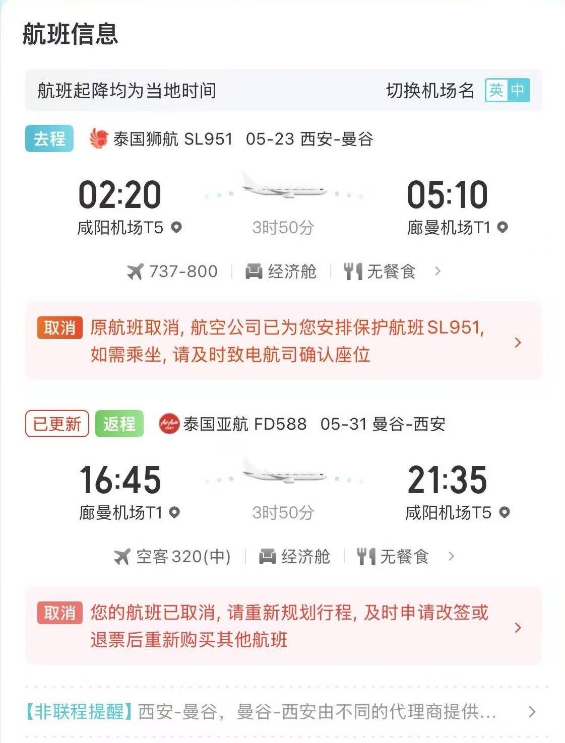 赵华瑞最开始还抱有航班能恢复的期待。他查询发现,去程航班取消,但回程航班仍在开放售票,因此一度怀疑是信息有误。直到4月3日,回程航班也被取消,他才彻底放弃等待。上周五,坏消息又来了——5月23日从西安飞曼谷的去程航班也被取消。