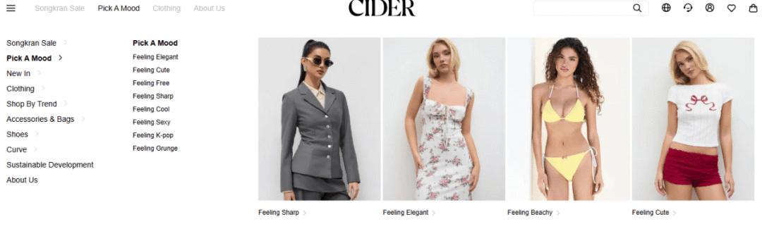 CIDER的核心竞争力之一,是独创的“Pick a Mood”情绪分类体系。在线上,用户可根据“可爱”“酷感”“优雅”等心情标签快速找到心仪款式。