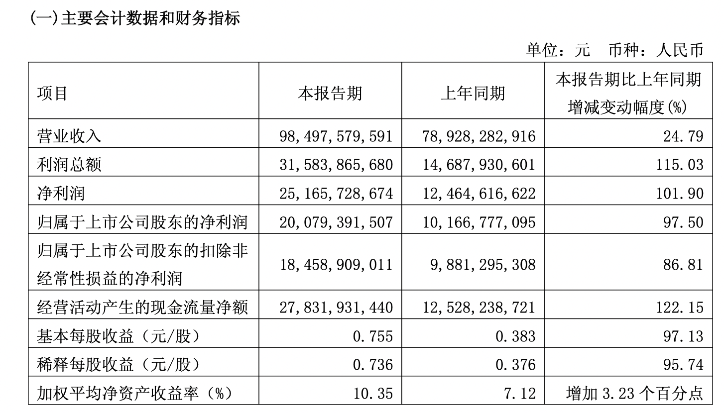 紫金矿业4月21日晚间发布公告称,2026年第一季度实现营业收入984.98亿元,同比增长24.79%;归属于上市公司股东的净利润200.79亿元,同比增长97.50%。