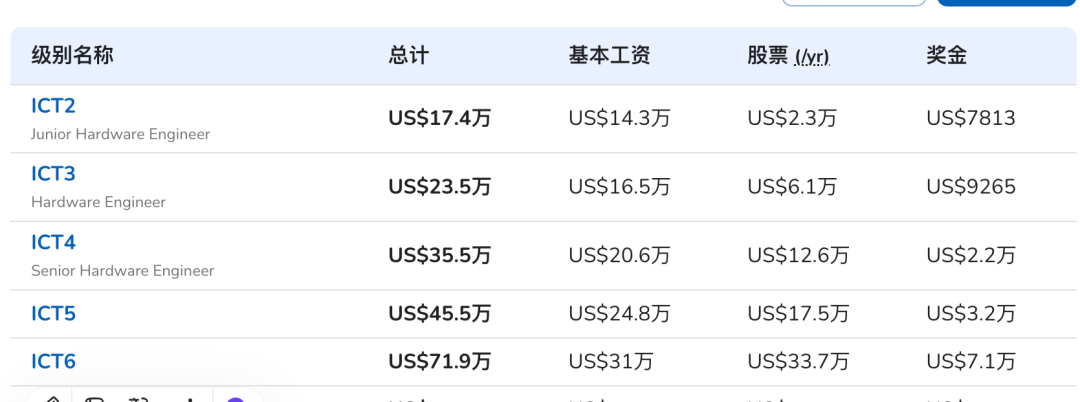 当然,苹果对硬件工程师也很大方。据levels.fyi数据,苹果硬件工程师包含薪酬、股票和奖金,ICT2级别到ICT6级别,每年薪酬在17.4万美元到71.9万美元。