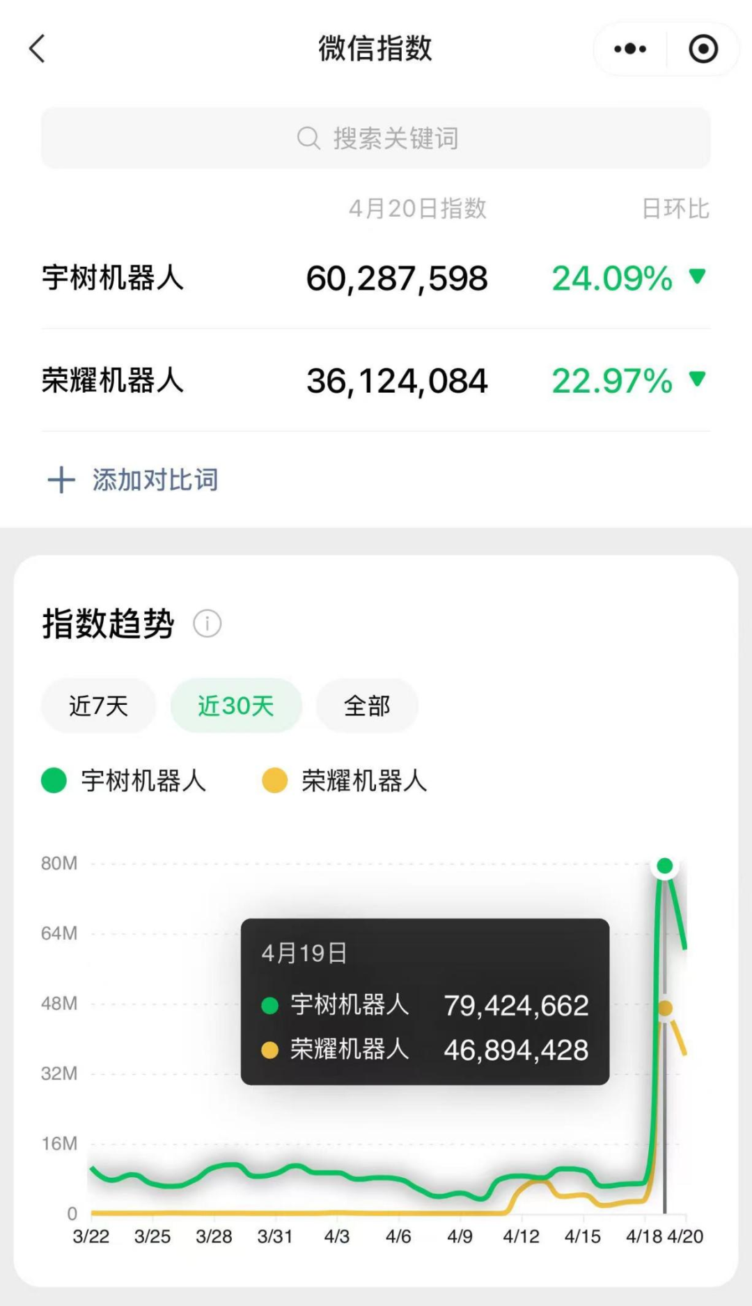 这一消息迅速在社交媒体发酵,“宇树机器人打破人类1500米世界纪录”的话题冲上热搜。宇树成功把公众注意力锁定在自己身上。尽管荣耀机器人也打破人类的世界纪录,但风头还是被宇树盖过了:无论是4月19日比赛当天还是赛后,宇树机器人的微信热度都高于荣耀机器人。
