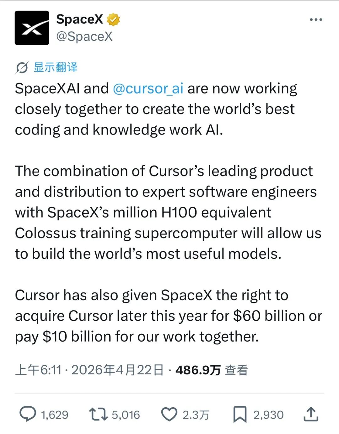 4月21日,SpaceX在X平台发文,宣布与Cursor达成深度合作,目标是打造“全球最好的编码和知识工作AI”。