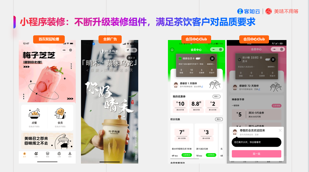 小程序不仅是点单入口,更是品牌宣传的文化阵地。客如云商家小程序提供多套专为茶饮设计的小程序模板,强化品牌文化叙事,让顾客在下单前就感受到品牌调性。下单时,系统可自动引导顾客加入企业微信,结合抽奖、消费送、会员日等内置营销玩法,将“过客”转化为可反复触达的资产。