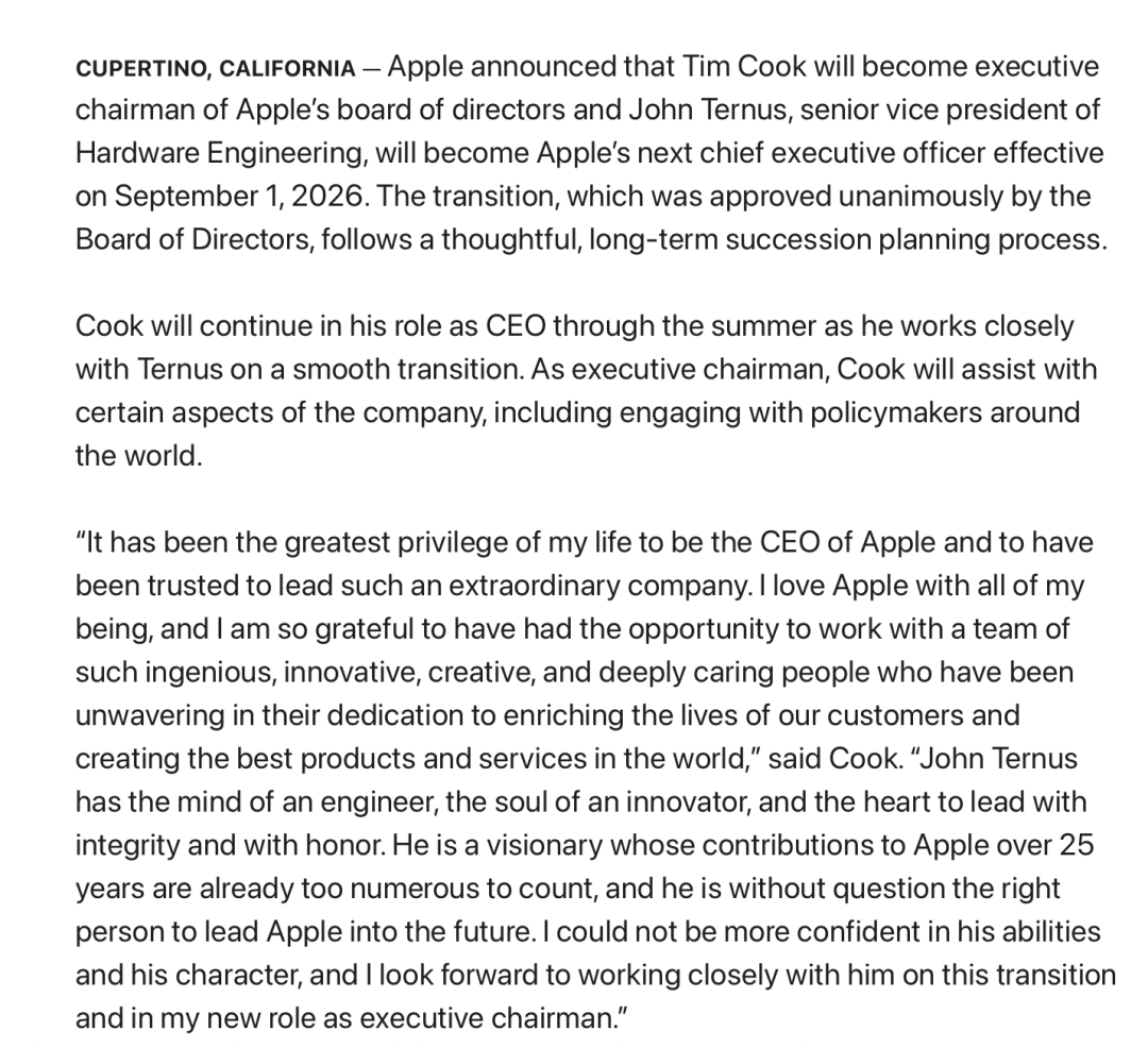 今天,我们宣布了我将在苹果开启旅程的下一步。在接下来的几个月里,我将过渡到一个新的角色,于九月卸任 CEO 一职,并出任苹果的执行董事长。将有人接替这个我心中认为是全世界最好的工作。这位领导者便是 John Ternus(约翰·特努斯),一位杰出的工程师与思考者。在过去二十五年里,他倾心打造了用户们深爱的苹果产品,执着于每一个细节,专注于我们让事物更出色、更大胆、更优美、更有意义的每一种可能。他是这份工作的不二人选。