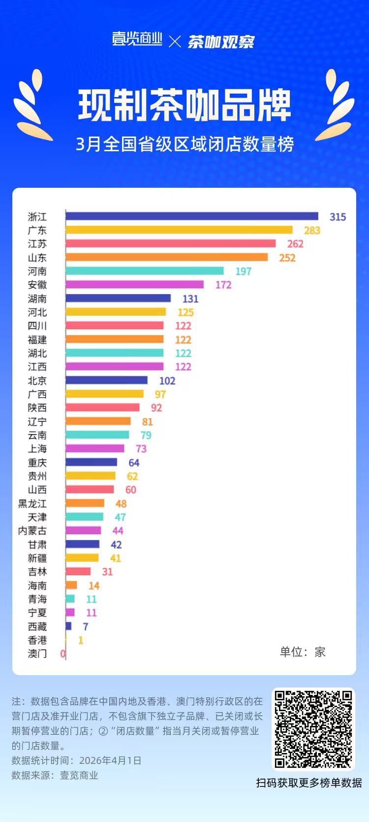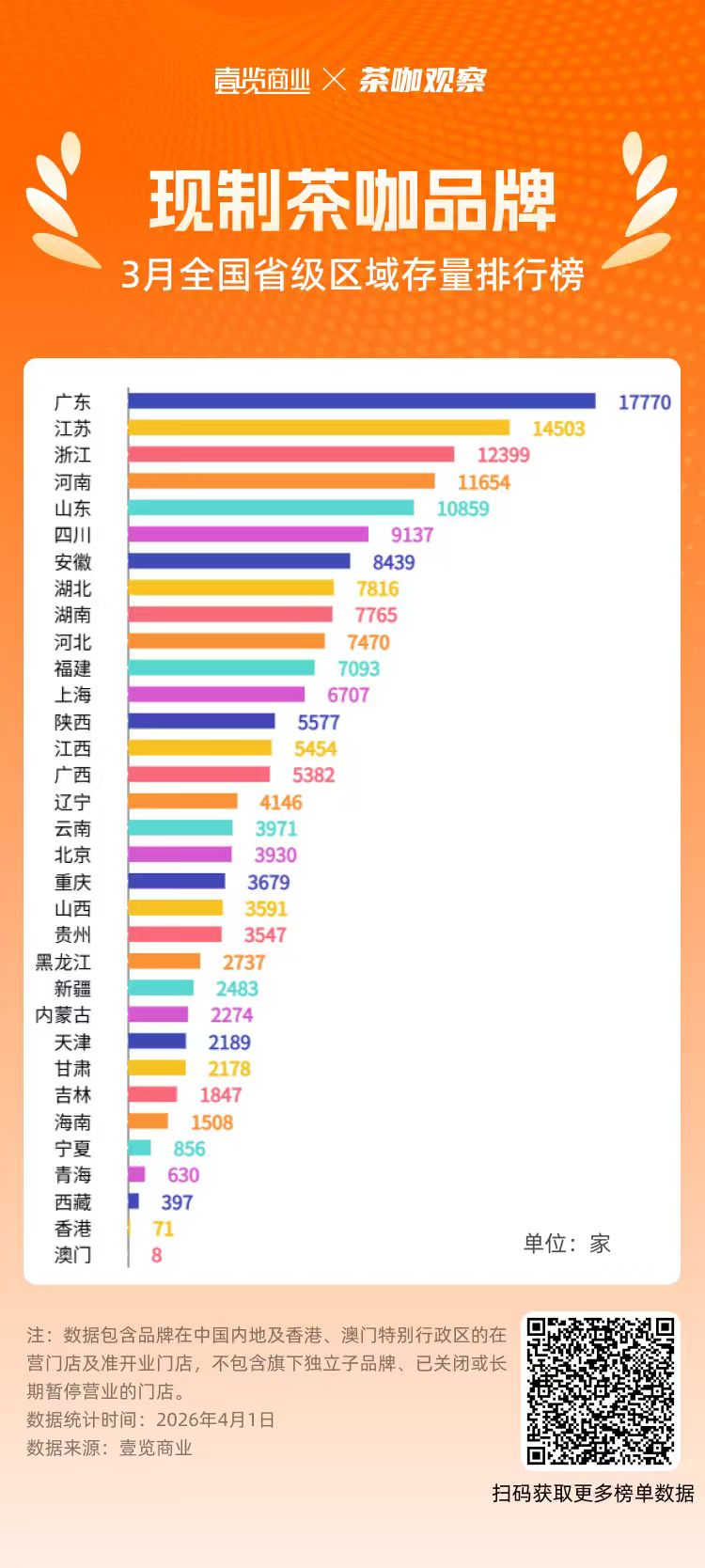 壹览商业数据显示,3月48个主流现制茶咖品牌门店总量达到17.81万家。