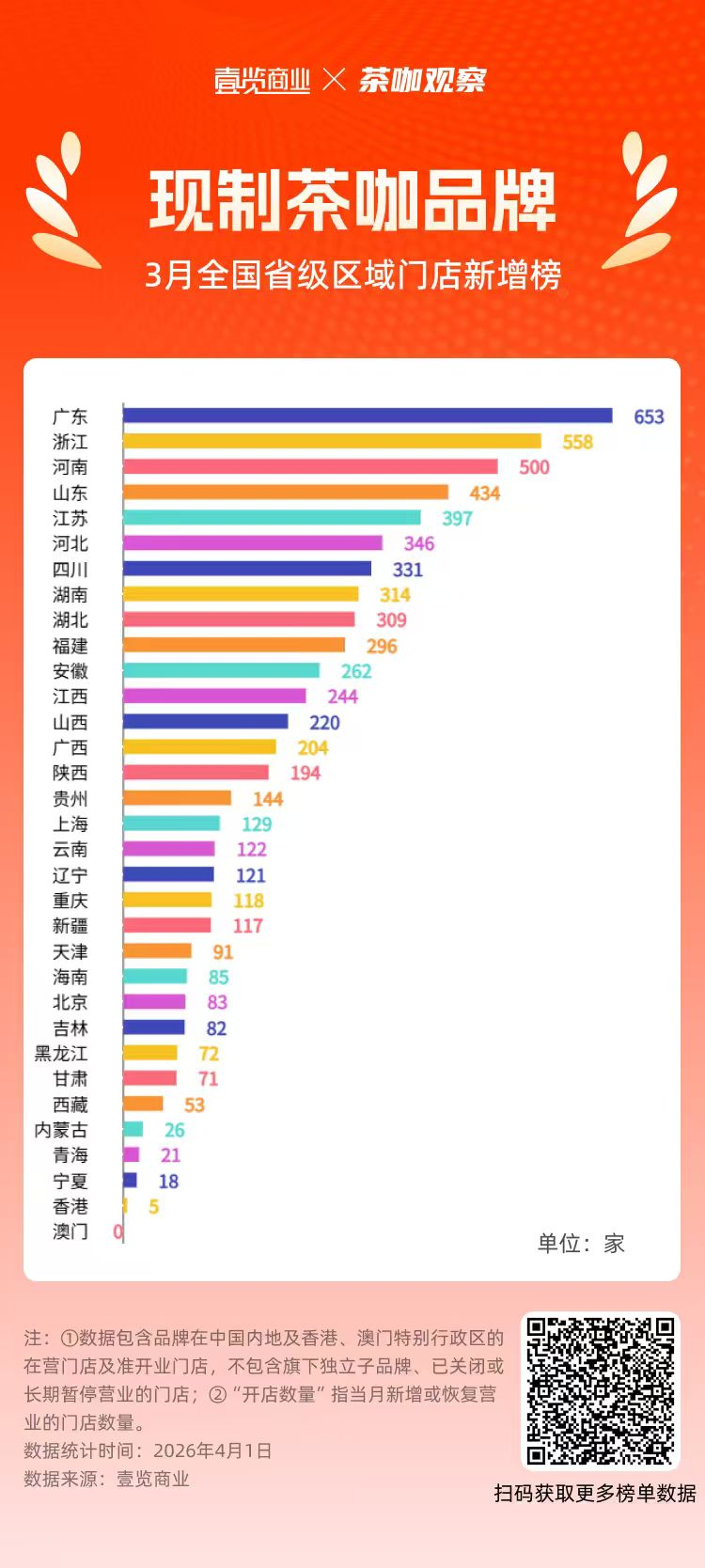 从新增门店来看,经济大省与人口大省共同构成新增门店的主力军。广东以653家门店数量位居第一,是唯一一家新增突破600家的省级区域;排在第二的是浙江,新开了558家门店。