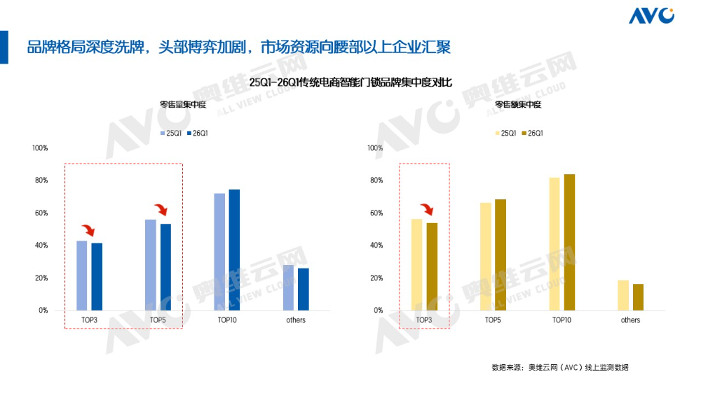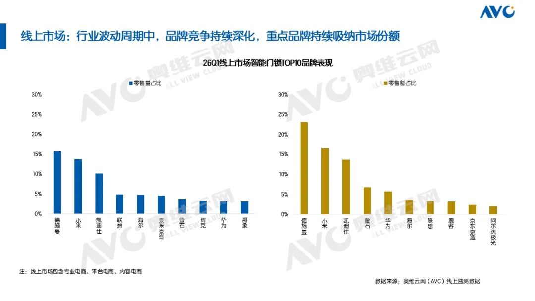 2026年一季度,传统电商智能门锁市场的品牌格局呈现出“头部博弈加剧、腰部力量崛起”的特征。奥维云网(AVC)线上监测数据显示,一季度TOP3品牌零售量份额为41%,TOP5品牌份额为53%,较去年同期均出现小幅收缩;市场集中度向核心品牌汇聚的趋势并未改变,一季度TOP10品牌零售量集中度提升至74%。