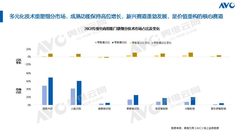 奥维云网(AVC)线上监测数据显示,2026年一季度传统电商市场中,猫眼大屏智能门锁零售量占比达49%,零售额占比高达69.5%,较2025年一季度分别提升1.6和8.4个百分点;人脸识别智能门锁零售量占比为41.5%,零售额占比60.9%,分别增长1.0和7.8个百分点,量额占比“剪刀差”持续扩大,说明成熟功能在产品结构升级中具备重要作用。